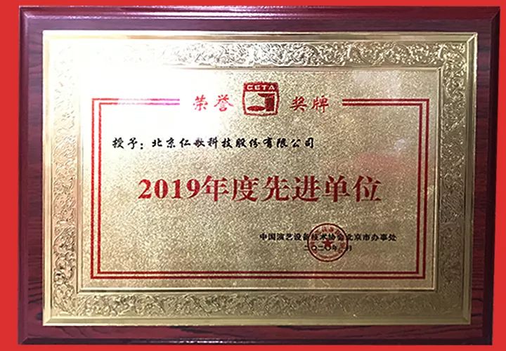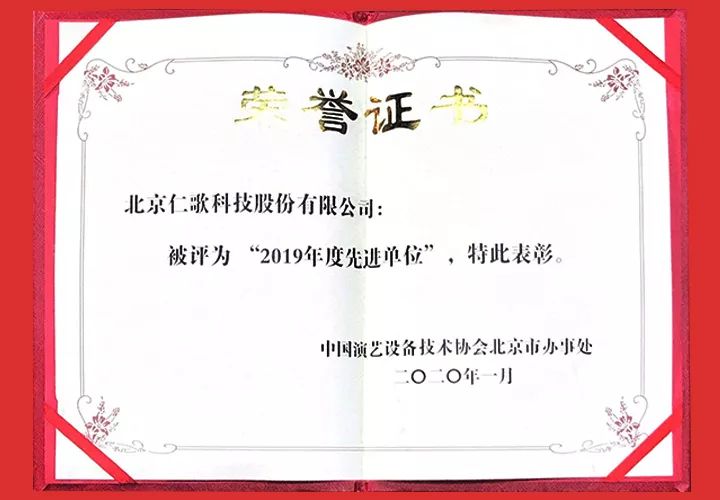 中國演藝設備技術協(xié)會北京辦事處授予北京仁歌科技股份有限公司“2019年度先進單位”并頒發(fā)授牌及證書