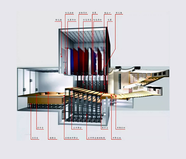 臺(tái)上設(shè)備:舞臺(tái)內(nèi)從臺(tái)口線到天幕分布著以下幾種機(jī)械設(shè)備:大幕機(jī)、幕類吊桿、二道幕機(jī)、燈光吊桿等。